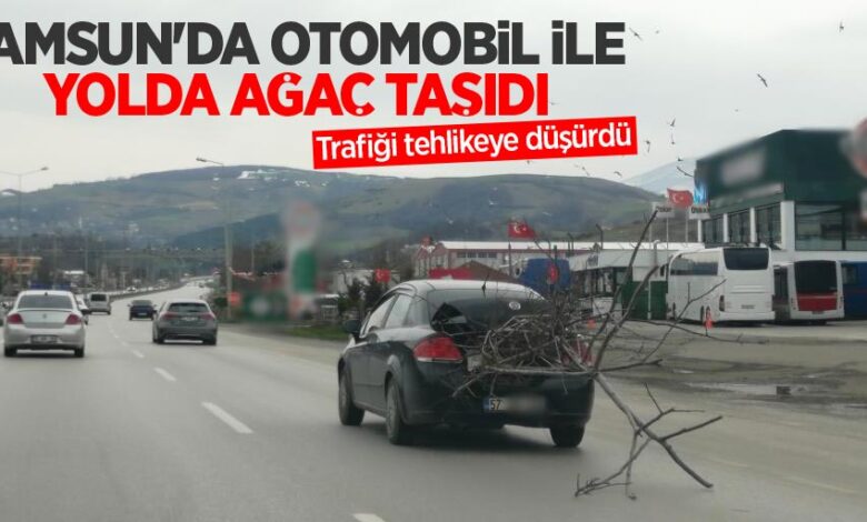 Otomobil sürücüsü aracının bagajına tam yerleştirmediği ve hiçbir güvenlik önlemi olmadan taşıdığı ağaçla yolda seyir etti. Ağaç dallarını yola sürterek seyahat eden sürücü, diğer sürücülerin korna ve selektörlerine rağmen Kavak istikametine doğru ilerlemeye devam etti.